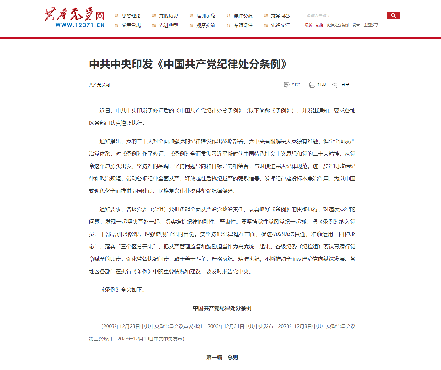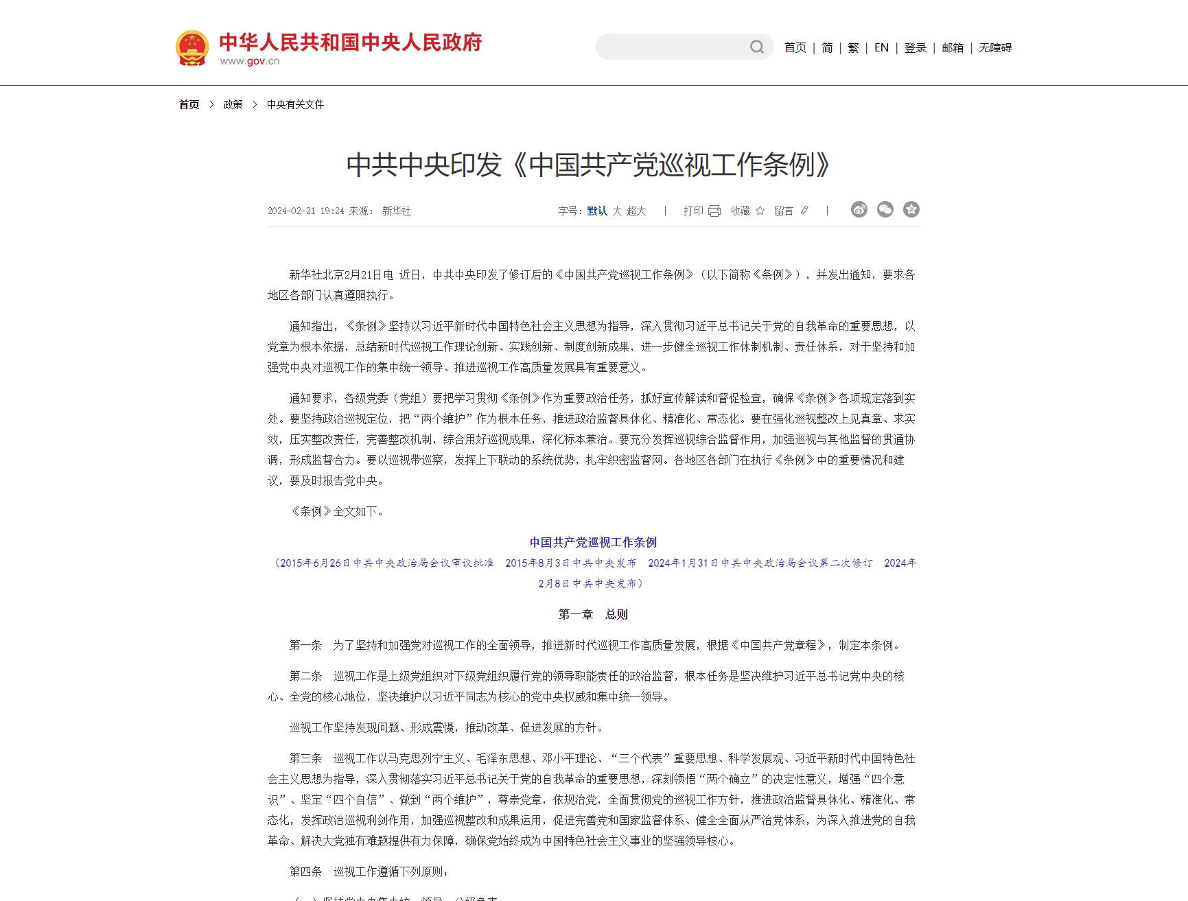 中国共产党问责条例(2019年修订,自2019年9月1日起施行) 第一条为了坚持党的领导,加强党的建设,全面从严治党,保证党的路线方针政策和党中央重大决策部署贯彻落实,规范和强化党的问责工作,根据《中国共产党章程》,制定本条例。第二条党的问责工作坚持以马克思列宁主义、毛泽东思想、邓小平理论、“三个代表”重要思想、科学发展观、习近平新时代中国特色社会主义思想为指导,...