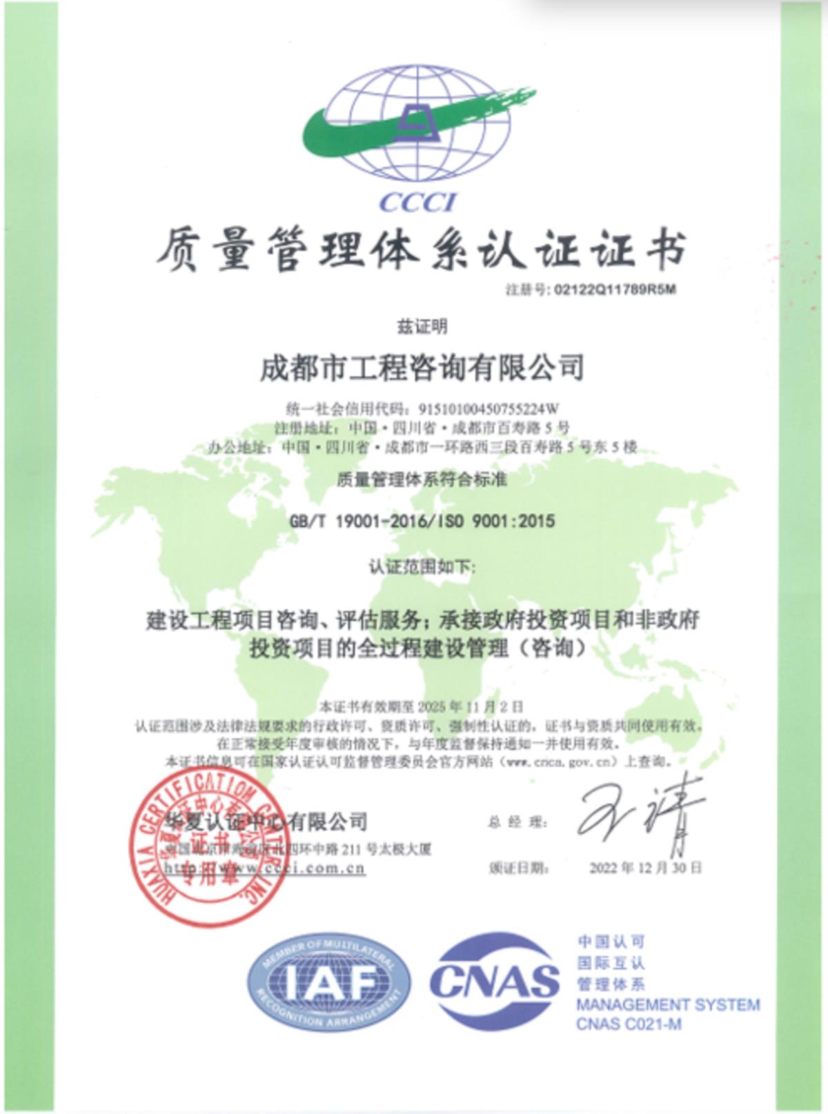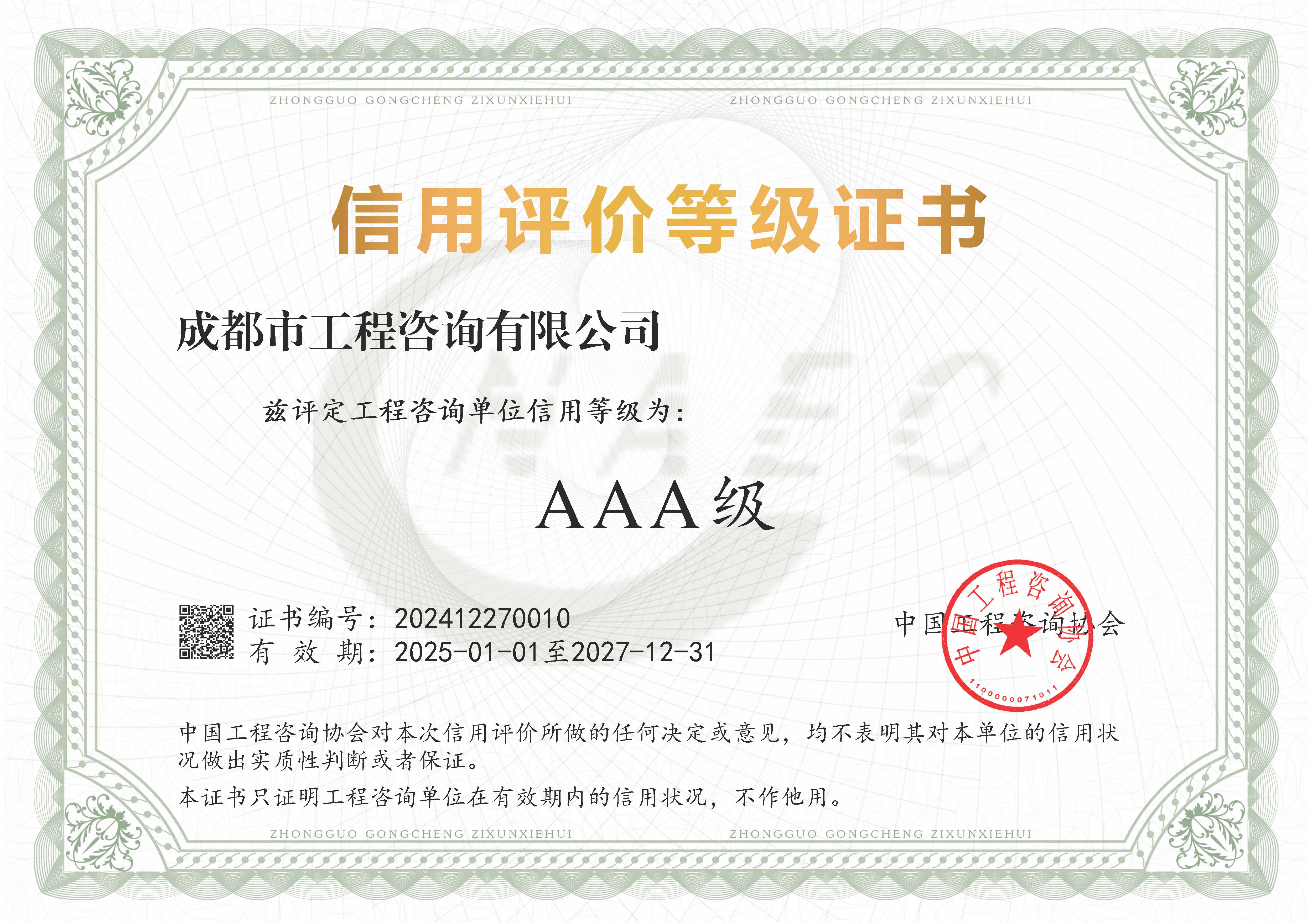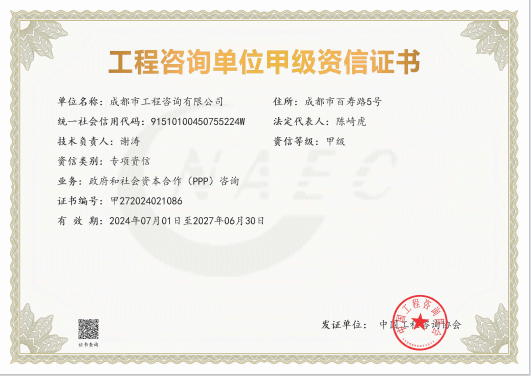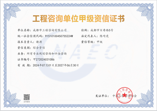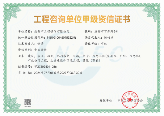 爱体育电子(中国)有限公司官网拥有工程咨询甲级综合资信、甲级专业资信和PPP甲级专项资信三项甲级资信证书和工程造价资质。甲级综合资信由建筑,水利水电,农业、林业,电子、信息工程(含通信、广电、信息化),市政公用工程,生态建设和环境工程,公路,其他(节能)8个甲级专业资信和电力(含火电、水电、核电、新能源),轻工、纺织,水文地质、工程测量、岩土工程,建材,铁路、城市轨道交通,其他(土地整理)和其他(旅游工程)7个其他专业组成。爱体育电子(中国)有限公司官网现已通过了GB/T19001-2016/ISO9001:2015质量管理体系、GB/T24001-2016/ISO14001:2015环境管理体系和GB/T45001-2020/ISO45001:2018职业健康安全管理体系认证。爱体育电子(中国)有限公司官网目前是四川省内唯一同时持有甲级综合资信、甲级专业资信和PPP甲级专项资信证书的综合性咨询机构,是四川省及成都市发展改革部门以及天府新区、东部新区、高新区、武侯区等20余个区(市)县的政府投资项目咨询服务机构。