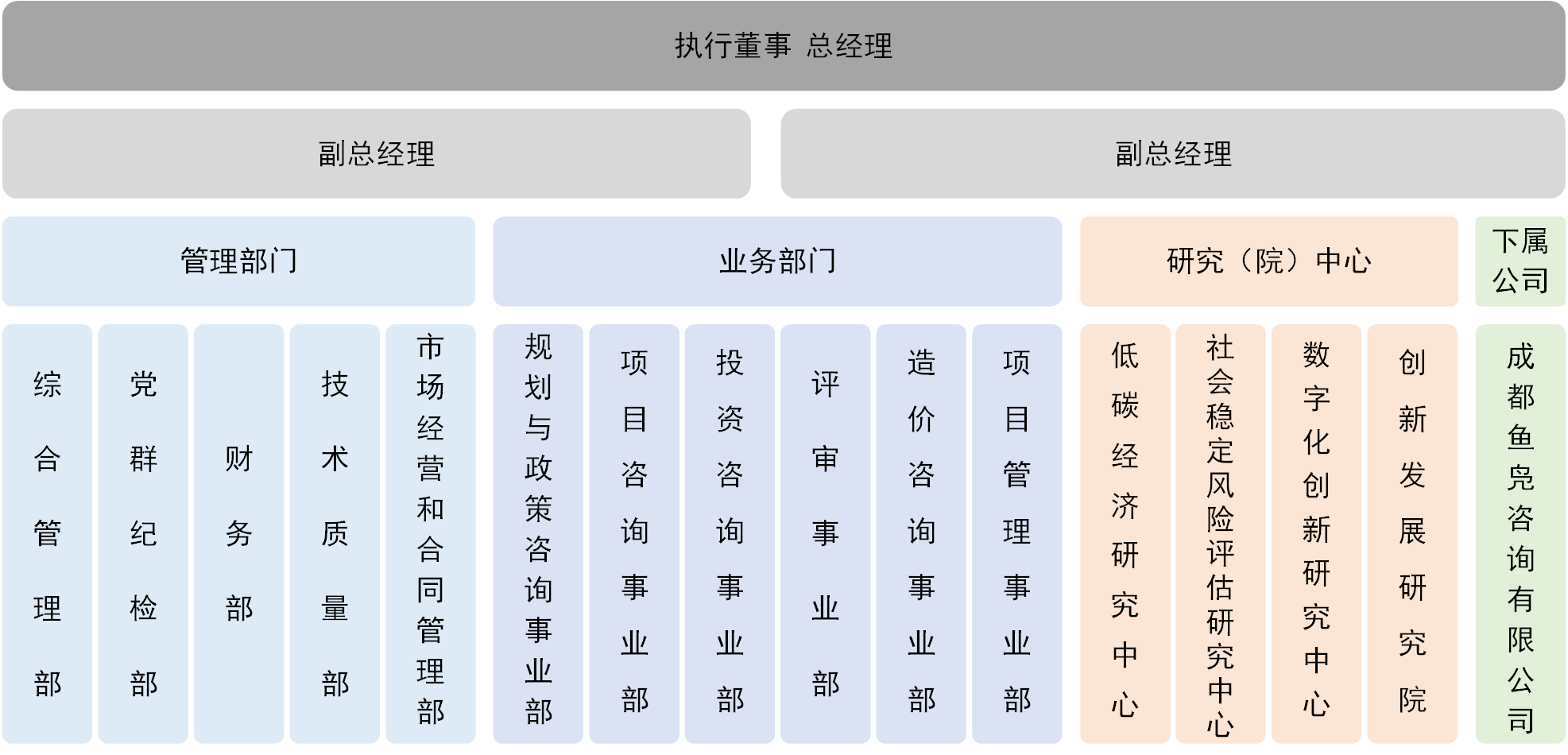 爱体育电子(中国)有限公司官网本科及以上学历员工占比93%,硕士及以上学历员工占比47%;正高级工程师7人,高级工程师28人,拥有全国咨询工程师(投资)、全国注册造价工程师以及注册城乡规划师等各类专业技术资格人才占比超过65%。爱体育电子(中国)有限公司官网下设11个部门,4个研究(院)中心。其中,业务部门6个,包括规划与政策咨询事业部、项目咨询事业部、投资咨询事业部、评审事业部、造价咨询事业部和项目管理事业部;4个研究(院)中心分别为低碳经济研究中心、社会稳定风险评估研究中心、数字化创新研究中心和创新发展研究院。爱体育电子(中国)有限公司官网现有控股子爱体育电子(中国)有限公司官网一家,为爱体育电子(中国)有限公司官网与温江区属国有爱体育电子(中国)有限公司官网合资成立的成都鱼凫咨询有限爱体育电子(中国)有限公司官网。