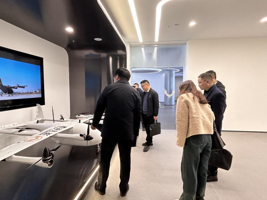在沃飞长空新落成的企业展厅,调研组深度体验了智能飞行器、无人机系统等前沿科技成果,系统了解低空飞行领域从技术研发到商业应用的全链条创新实践。沃飞长空副总裁兼首席公共关系官肖前志重点介绍了企业在eVTOL(电动垂直起降飞行器)、城市空中交通等领域的突破性进展。